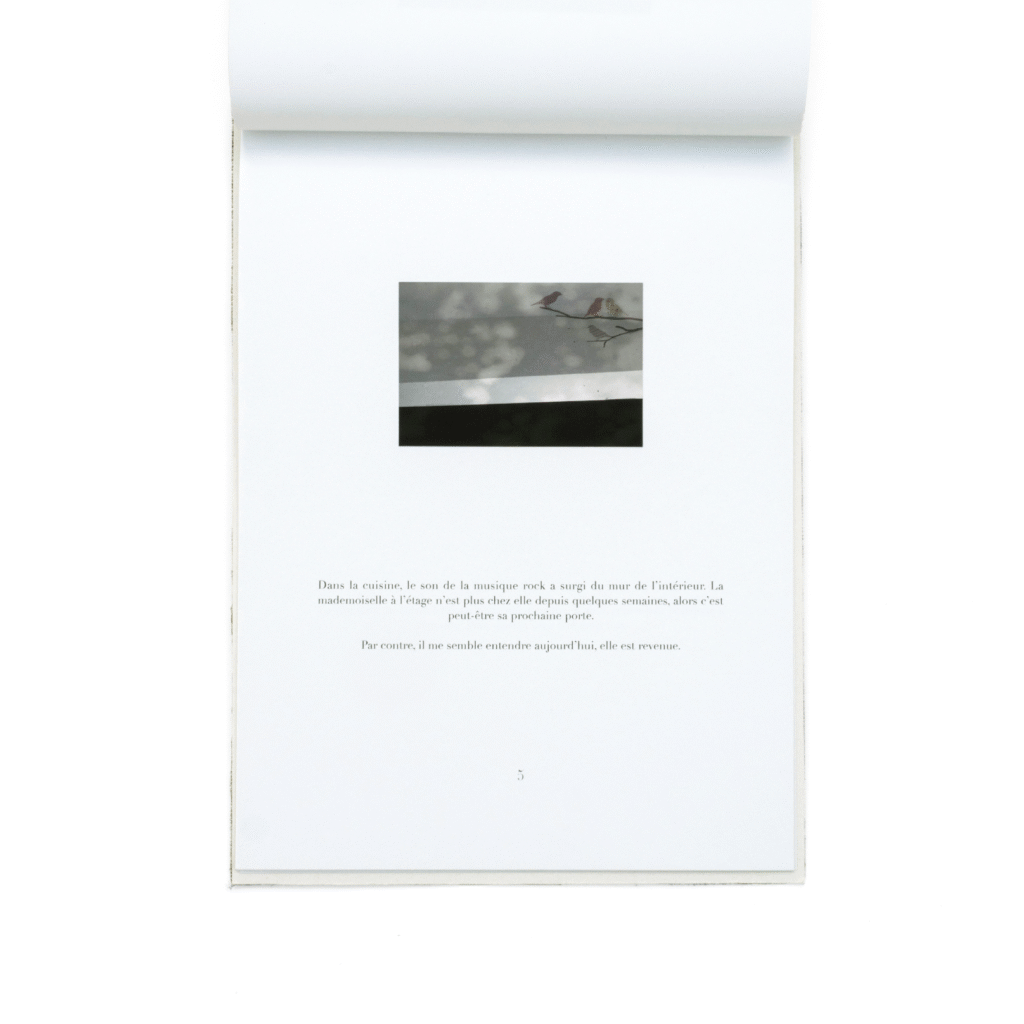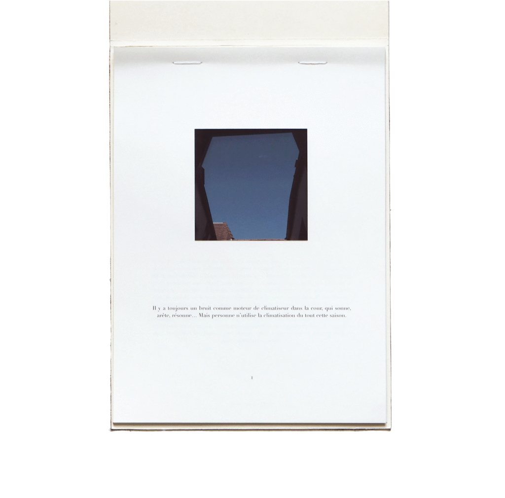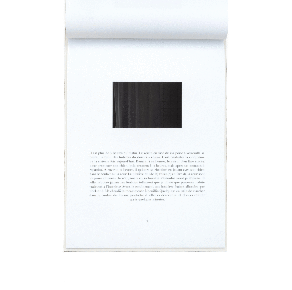 Ce travail ressemble à un journal de confinement, réalisé pendant cette période particulière. J’essaie de créer une impression liée à l’espace de mon appartement, évoquant un état de désordre et de solitude. Le texte se concentre principalement sur le son, envisagé comme un moyen essentiel de se connecter au monde extérieur. Le travail explore aussi les interactions possibles entre texte et image